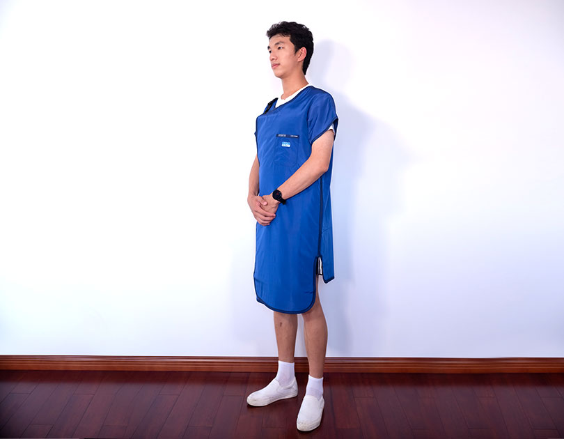 铅衣分单面铅衣、双面铅衣、分体式和连体式,包括:无袖、半袖、长袖,长袖,不论拍片还是CT都必须对其他部位进行遮挡。